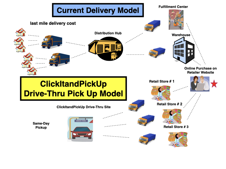 ClickItandPickUp, established in 2018, expects to be the first to provide on-line merchants same day delivery to their consumers at half the cost of typical UPS and Fedex 3-5 day ground delivery. Through conveniently located, neighborhood drive-thru retail area sites, Clickitandpickup is bringing on-line retailers and their customers the best of both worlds: the lower pricing and wider selection that comes from shopping on-line with the convenience and instant gratification of local retail shopping. With ClickItandPickUp drive-thru package pickup, customers can order on-line, and that very same day get into their cars, drive 5-10 minutes and pick up their orders from multiple retailers on one quick trip.